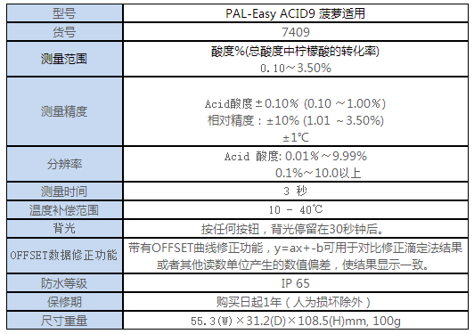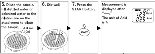 通用测量步骤 (*用于精确测量) 第一步.请将干净的量杯容器放置在电子秤上,并且测量数值为0.00 第二步.请将1.00g左右样品倒入量杯容器,根据需要的倍率用蒸馏水水进行稀释,然后使用塑料吸管做进行搅均匀 根据不同量杯的刻度不同,稀释的倍率也会不同。 第三步.将蒸馏水倒入在量杯容器中,将样品稀释直到50.00g 第四步.使用样品勺或者塑料吸管进行搅拌均匀,然后用移液枪或者塑料吸管滴入0.6ml在测量棱镜中 第五步. 按下START键,Acid酸度测量值将显示出来。(如果你第一次测量糖度值可以简单地按下START按钮,再次测量酸度值) (*用于快速测量) 第一步.用移液枪或者塑料吸管滴入0.2ml样品,然后将蒸馏水倒至附属装置的基准线或者用移液枪将样品稀释50倍至10ml(加水9.8ml) 第二步.使用样品勺或者塑料吸管进行搅拌均匀 第三步. 按下START键,Acid酸度测量值将显示出来。
