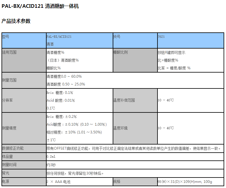 产品简介 为了方便更多的农业、水果行业的客户快速检测糖酸比,提供更高的测量服务和更低的价格,ATAGO(爱拓)研发了这款新的糖酸一体机PAL-BX/ACID121,又称糖酸折光仪,快速地进行糖酸比测量,可以同时检测如下:柑橘,葡萄,葡萄酒,番茄,草莓,糖度和酸度测量数值!摒弃传统的滴定方法,不需要昂贵的试剂或复杂的测量设置。糖酸比指标现在被广泛的应用于水果品种筛选,水果分级,水果成熟度判断,水果口感评价中。 PAL-BX/ACID 121糖酸一体机的测量方法 用移液枪滴入0.3毫升样品到仪器棱镜,按下START键,Brix测量值将显示出来 请将1.00g左右样品倒入量杯容器,根据需要的倍率用蒸馏水水进行稀释,然后使用玻璃吸管做进行搅均匀 根据不同量杯的刻度不同,稀释的倍率也会不同。 将蒸馏水倒置附属装置的基准线或者用移液枪将样品稀释50倍至10ml(加水9.8ml),并搅拌均匀。 按下START键,Acid酸度测量值将显示出来。 糖酸比的测量显示方法 在测量值显示(Brix测量值和酸度值)后,直接按R键,即可马上显示糖酸比例数值。 PAL-BX/ACID 121糖酸一体机的标准版配置: 测试箱套装包含:主机一台,一次性塑料吸管五根,附属装置基准线稀释圈一个,AAA电池两节。