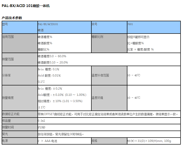 产品简介 为了方便更多的农业、水果行业的客户快速检测糖酸比,提供更高的测量服务和更低的价格,ATAGO(爱拓)研发了这款新的糖酸一体机PAL-BX/ACID101,又称糖酸折光仪,快速地进行糖酸比测量,可以同时检测如下:柑橘,葡萄,葡萄酒,番茄,草莓,糖度和酸度测量数值!摒弃传统的滴定方法,不需要昂贵的试剂或复杂的测量设置。糖酸比指标现在被广泛的应用于水果品种筛选,水果分级,水果成熟度判断,水果口感评价中。 PAL-BX/ACID 101糖酸一体机的测量方法 用移液枪滴入0.3毫升样品到仪器棱镜,按下START键,Brix测量值将显示出来 请将1.00g左右样品倒入量杯容器,根据需要的倍率用蒸馏水水进行稀释,然后使用玻璃吸管做进行搅均匀 根据不同量杯的刻度不同,稀释的倍率也会不同。 将蒸馏水倒置附属装置的基准线或者用移液枪将样品稀释50倍至10ml(加水9.8ml),并搅拌均匀。 按下START键,Acid酸度测量值将显示出来。 糖酸比的测量显示方法 在测量值显示(Brix测量值和酸度值)后,直接按R键,即可马上显示糖酸比例数值。 PAL-BX/ACID 101糖酸一体机的标准版配置: 测试箱套装包含:主机一台,一次性塑料吸管五根,附属装置基准线稀释圈一个,AAA电池两节。
