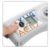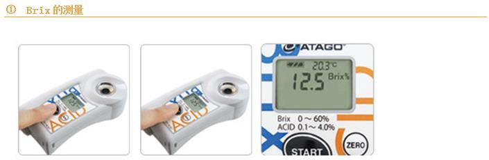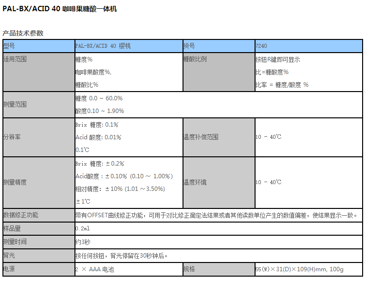 产品简介 为了方便更多的农业、水果行业的客户快速检测糖酸比,提供更高的测量服务和更低的价格,ATAGO(爱拓)研发了这款新的糖酸一体机PAL-BX/ACID40,又称糖酸折光仪,快速地进行糖酸比测量,可以同时检测如下:柑橘,葡萄,葡萄酒,番茄,草莓,糖度和酸度测量数值!摒弃传统的滴定方法,不需要昂贵的试剂或复杂的测量设置。糖酸比指标现在被广泛的应用于水果品种筛选,水果分级,水果成熟度判断,水果口感评价中。 PAL-BX/ACID 40 咖啡果糖酸一体机的测量方法 用移液枪滴入0.3毫升样品到仪器棱镜,按下START键,Brix测量值将显示出来 请将1.00g左右样品倒入量杯容器,根据需要的倍率用蒸馏水水进行稀释,然后使用玻璃吸管做进行搅均匀 根据不同量杯的刻度不同,稀释的倍率也会不同。 将蒸馏水倒置附属装置的基准线或者用移液枪将样品稀释50倍至10ml(加水9.8ml),并搅拌均匀。 按下START键,Acid酸度测量值将显示出来。 糖酸比的测量显示方法 在测量值显示(Brix测量值和酸度值)后,直接按R键,即可马上显示糖酸比例数值。 PAL-BX/ACID 40 咖啡果糖酸一体机的标准版配置: 测试箱套装包含:主机一台,一次性塑料吸管五根,附属装置基准线稀释圈一个,AAA电池两节。
