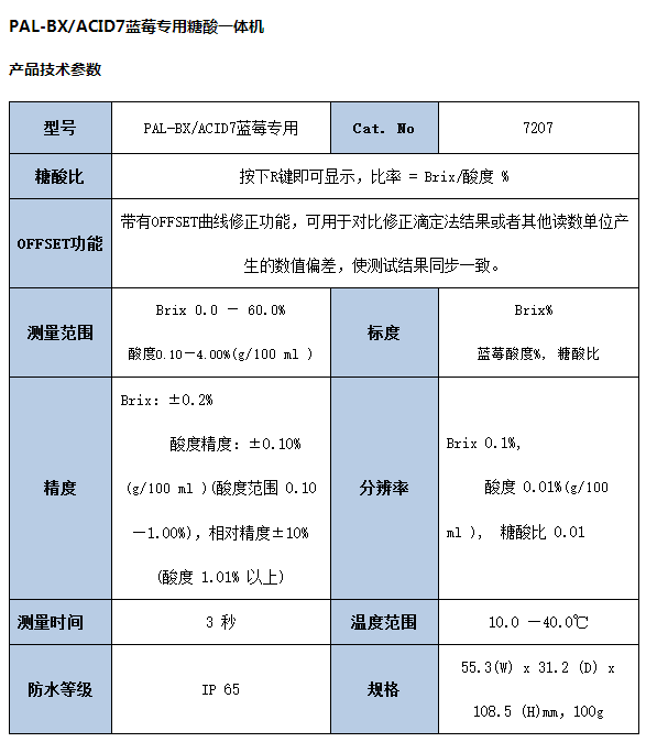 PAL-BX/ACID7蓝莓专用糖酸一体机产品简介PAL-BX/ACID7糖酸一体机专门设计为测量蓝莓糖酸度,带有OFFSET曲线修正功能,可用于对比修正滴定法结果或者其他读数单位产生的数值偏差,使测试结果同步一致。
