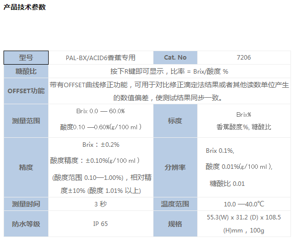 PAL-BX/ACID6香蕉专用糖酸一体机产品简介PAL-BX/ACID6糖酸一体机专门设计为测量香蕉糖酸度,带有OFFSET曲线修正功能,可用于对比修正滴定法结果或者其他读数单位产生的数值偏差,使测试结果同步一致。