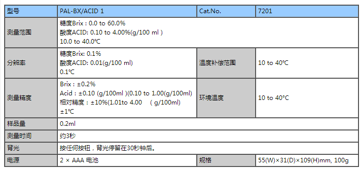 产品介绍 为了方便更多的农业、水果行业的客户快速检测糖酸比,提供更高的测量服务和更低的价格。让跟多的农业和水果行业客户认识到不仅仅需要检测糖度,还需要检测酸度,最合适的糖酸比才是评价水果的最好指标。ATAGO(爱拓)研发了这款新的糖酸一体机,不仅可以同时检测水果的糖酸比,而且不需要繁杂的操作方法和酸度测定试剂。PAL-BX/ACID1 柠檬酸糖度酸度一体机 可以用来测量柑橘、橙子、苹果等水果的糖度和果酸含量,并将其酸度以柠檬酸的多少来表示。 产品技术参数