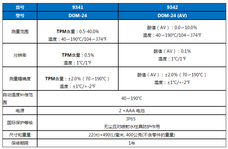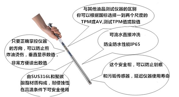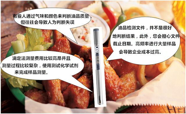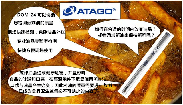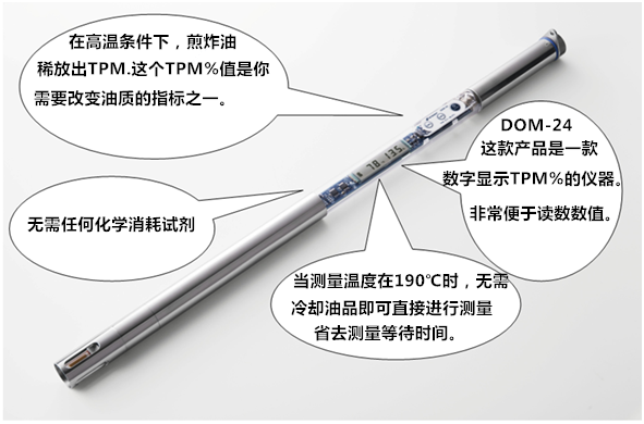 【产品介绍】 如何在合适的时间内改变更换煎炸油品质?在高温条件下,煎炸油释放出TPM,这个TPM%值,是您需要改变油质的指标之一,用于评估油品老化变质的极性组分含量(TPM)是否依然在合理范围之内?DOM-24煎炸油品质检测仪以%TPM百分含量来实现食用油品质检测。是食品安全稽查人员、酒店和餐厅、食堂、快餐连锁、质量控制、食品生产等领域的理想测量仪器。DOM-24煎炸油质量检测仪可直接告知您何时您的食用油中的TPM值到达临界点以及您是否需要更换新油的协助工具。是一种快速,安全,高效食用油品质检测仪,能够快速检测食用油中的极性化合物组分含量。DOM-24油品测定仪能够在油温较高的环境下使用,适用于各种煎炸的食用油品质检验,为厨房健康合理用油及食用油现场检测提供解决方案。 【参考标准】 在《GB7102.1-2003食用植物油煎炸过程中的卫生标准》中规定煎炸油的极性组分含量不超过27%。煎炸油品质检测仪应用于公共卫生监督所、食品药品监督局及餐饮行业的食用油品质检测,达到检验食用油品质、保证产品质量、保证食品安全、指导食品生产过程中质量控制的目的,更为质监部门现场快速检测提供支持。 【油类检测】 煎炸油品质检测仪检测种类全,几乎适用于所有油及脂类的检测 ,如玉米油,油菜油,大豆油,芝麻油,棕榈油,橄榄油和花生油等植物油,动物的油脂也能进行测量。 在高温条件下反复使用的煎炸油,油质产生劣变,不仅影响油的味道,还会损害人们身体健康。因此对油的质量进行检测、监督,已成为食品卫生监督必不可缺少的内容。目前,餐饮行业以及食用油厂家并无速检手段。检测均需要等油冷却后在实验室完成,成本既高又费时。实际生活中人们常根据油的颜色、粘度及味道判断油质,然后将劣变的油倒掉,既造成大量浪费,又污染环境。使用现场快速检测仪可及时掌握油质信息,适时稀释或更换用油,保障食品卫生安全。