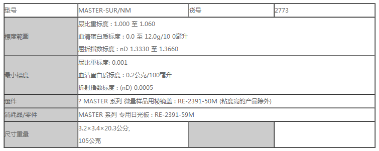 MASTER-SUR/NM临床折射仪MASTER-SUR/NM是临床用折射仪,它是测量血清蛋白,尿比重以及折射率的产品。它在材料上采用的树脂具有耐盐性及耐酸性,可以防止腐蚀。与MASTER-SUR/NM不同,这款没有带防水功能及自动温度补偿功能。您可以手动校正。