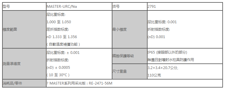 MASTER-URC/Nα 是专门测量尿比重的折射仪。它只需一滴样品就可测量。测量简便,可随身携带。它在材料上采用的树脂具有耐盐性及耐酸性。这款带防水功能及自动温度补偿功能(IP65)。