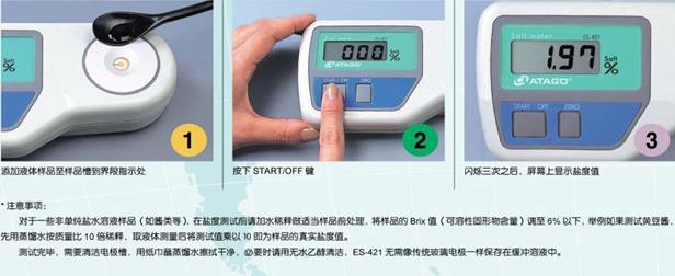 添加液体样品至样品槽界限指示处→按下START/OFF键→闪烁三次之后,屏幕上显示电导数显盐度计盐度值